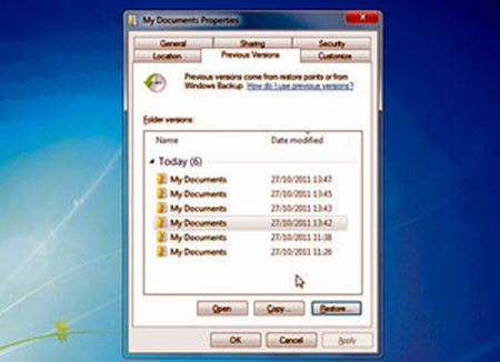 Nếu bạn vô tình xóa đi một tập tin, click chuột phải vào folder mà nó được khôi phục và chọn "Restore previous version" từ danh mục xuất hiện. Sau đó bạn có thể click đúp vào một trong những phiên bản trước đó của folder đó và tạo một bản sao của tập tin bạn đang cố gắng để lấy lại.
